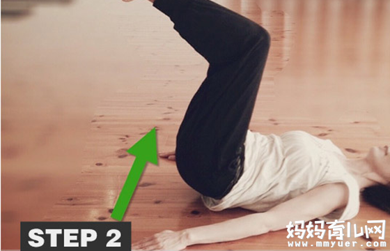腿保持直角,吸气并向上提臀。呼气的时候放下。肚脐以下的部位做向上运动,有意识地保持腿不动。(重复5~10次左右)