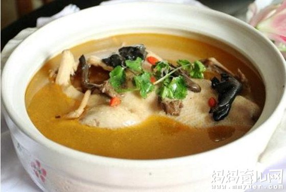 (3)老鸭洗净加生姜、黄酒熬汤至八成熟后,放入莲藕、黑木耳煮熟后,放入适量精盐、鸡精适量即可。