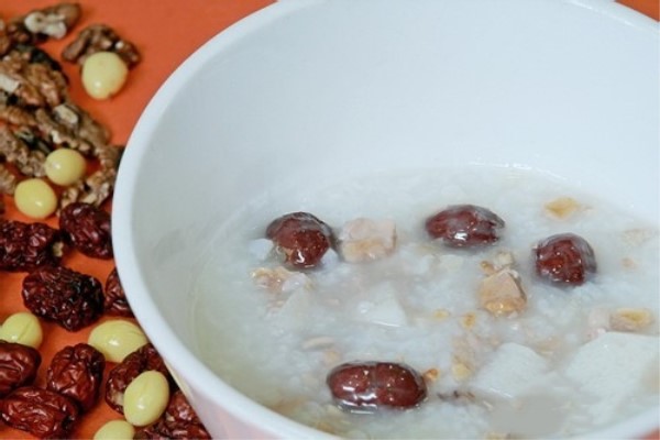 准备黄实粉30克、山药粉30克、核桃仁20克、去核大枣8颗,放入喜欢的粥中,一同熬煮。具有补肾气、固肾源的功效。