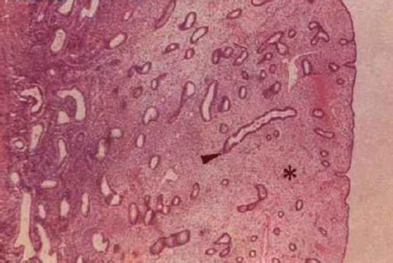 【分泌期】:排卵以后在黄体分泌孕激素和雌激素的影响下,子宫内膜出现分泌现象。分泌期时子宫内膜厚度为0.5-0.6cm,在女性排卵后的1-5天里,子宫内膜继续增厚,排卵后的6-10天里,子宫内膜出现高分泌状态,此时腺体弯曲与扩张达到高峰。