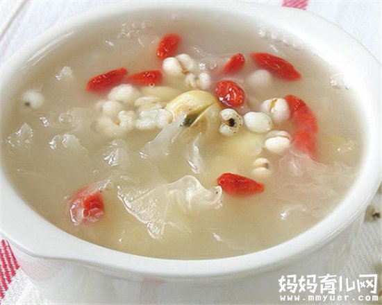 大米洗净后浸泡30分钟;将银耳泡水,待发好后洗净并去掉粗蒂,切片;将莲子及枸杞洗净后,与银耳、大米一同放入锅里,加水以大火煮开,再以小火熬煮40分钟,出锅时加入冰糖调味即成。