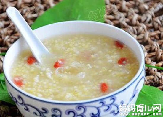做法:将锅置火上,放入适量清水、100克小米,先用旺火煮沸后,再改用小火熬煮至粥浓,打入2只鸡蛋,略煮即成,以100克红糖调味后进食。