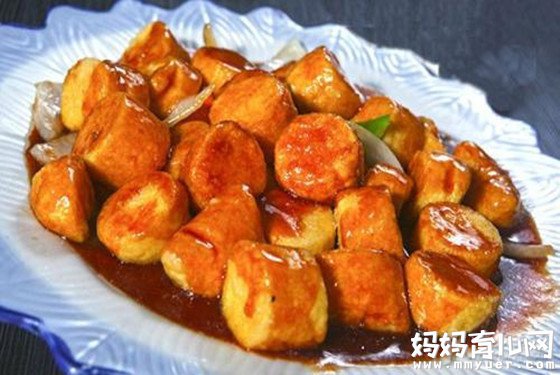 5.酱汁浓稠后关火,稍晾凉一下倒入日本豆腐,轻轻翻拌均匀,让每块日本豆腐都粘上酱汁即可