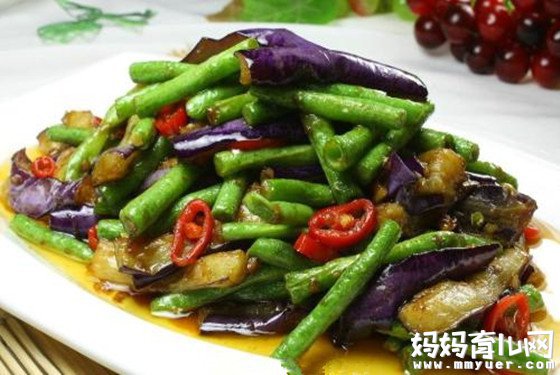 3.锅内加入2大匙油,烧热后放入茄子、菜豆一起炒香,再加入盐、高汤焖煮至熟即可。
