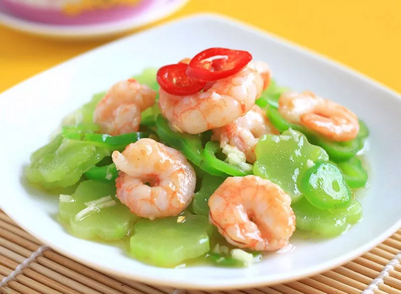 ②锅中留底油,下蒜姜爆香,后放莴笋丁翻炒一下。接着下青红椒炒匀,待锅中莴笋丁色变深绿,放盐味精调味关火。最后放虾仁,适当翻炒即可。