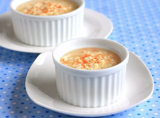 【用料】豆腐50克、胡萝卜20克、虾2只、肉汤1小碗