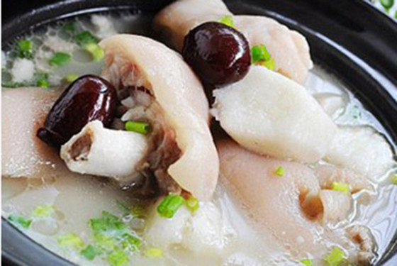 原料:猪脚500克,大红枣30克,花生米30克,生姜、葱、花生油、盐、清汤各适量。