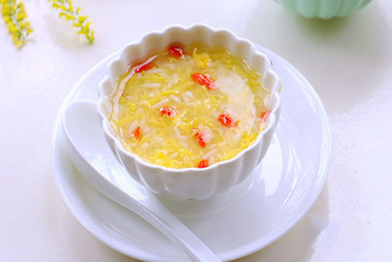 2、再打入鸡蛋,煮成蛋花状即可,可趁热服用。