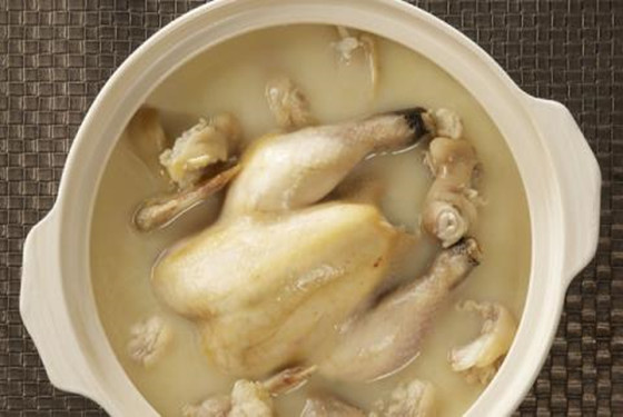 3、放入鸡块、盐、酱油、白糖,添适量汤烧开,撇去浮沫,盖上盖,放火上火靠至肉烂汤浓时加味精,