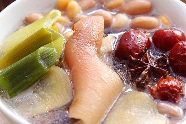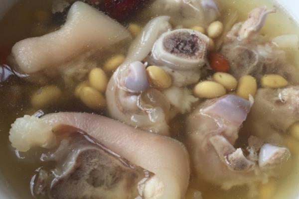 做法:将黄豆洗净后放入温水中浸泡,猪脚洗净后剁成大小均匀的块状;然后将猪脚放入炖锅中加入适量的姜片,先用大火煮开焯水捞出再次洗净;将洗好的猪脚、黄豆、姜片以及适量的清水一同倒入锅中,用大火煮开后转为小火慢煲2-3小时即可。