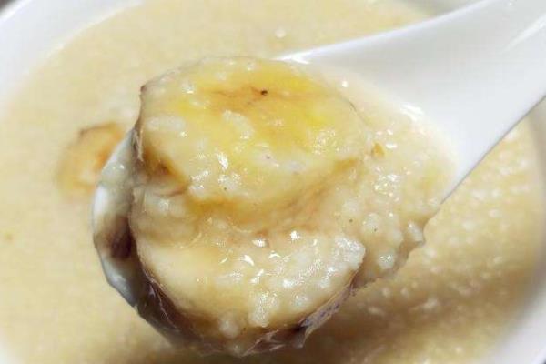 做法:将小米洗净后在清水中浸泡2小时,准备适量的香蕉剥皮后切成大小均匀的小块;然后将小米倒入煮锅中加上适量的清水,先用大火将小米煮开撇去多于的浮沫,再转为小火慢煮,将粥煮制粘稠状态后倒入切好的香蕉搅拌均匀,起锅前可以加入几颗冰糖调味。