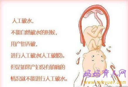 医护人员有时会在产妇分娩前或分娩时做人工破水。通常使用一种钝的器械,温和地插入阴道,以割破水袋,此过程并不会使产妇感到疼痛,只是有点类似内诊般的不舒服,在温热的羊水涌出时,护士会先以产褥垫置于其下,以利吸收,产妇可能会有压力减轻的感觉。