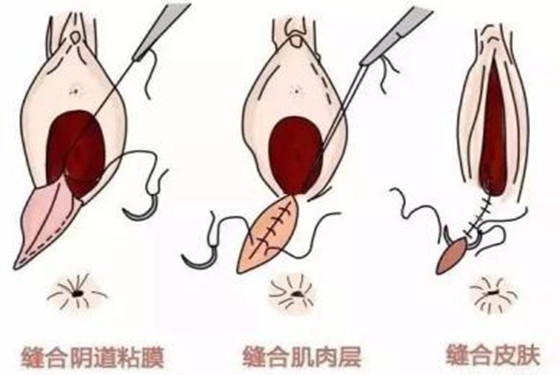 用左手两指分开阴道,找到切口创缘的顶端上约0.5cm处开始缝合。先将阴道粘膜及粘膜下组织以0号铬制肠线作连续“锁边”缝合或间断缝合至阴道口(以处女膜为标志)然后将深部组织作2~3层间断缝合,最后用丝线缝皮或用肠线作皮内连续缝合。缝合注意将组织对齐,不要过紧但不能留有死腔,以免出血或形成血肿。