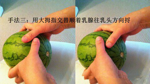 3.用大拇指交替顺着乳腺往乳头方向捋。如果乳房有硬块,就用大拇指交替着,连揉带捋地把硬块往乳头方向擀。