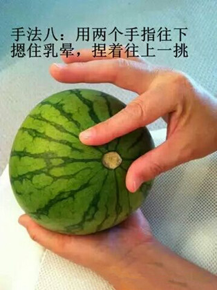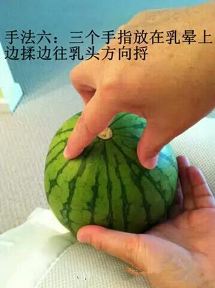 6.三个手指放在乳晕上,边揉边往乳头方向捋。