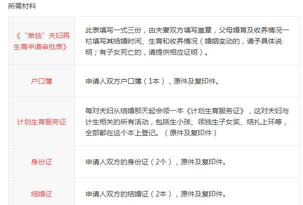 所需材料: 计划生育服务证 结婚证 身份证 户口簿 《“单独”夫妇再生育申请审批表》
