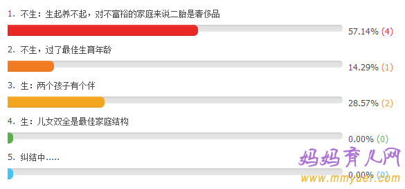 从这张调查表中我们可以清楚的看到,57%的人是不想生,主要原因是养孩成本高,支撑不起。还有14%的人不想生,是因为年龄大了,过了最佳生育年龄。而决定想生二孩的,比例仅占总数的28%。由此可见,生与不生的比例相差甚大。所以,不难想象,哪天二胎政策真的全面放开了,准备生两孩的估计也不是太多。
