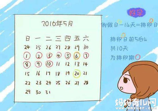 女性生理受激素影响而呈现周期性变化,比如,以月经周期30天为例,这次月经来潮的第1天在9月15日,那么下次月经来潮是在10月15日(9月15日加30天),再从10月15日减去14天,则10月1日就是排卵日。排卵日及其前5天和后4天,也就是9月26~10月5日这十天为排卵期。