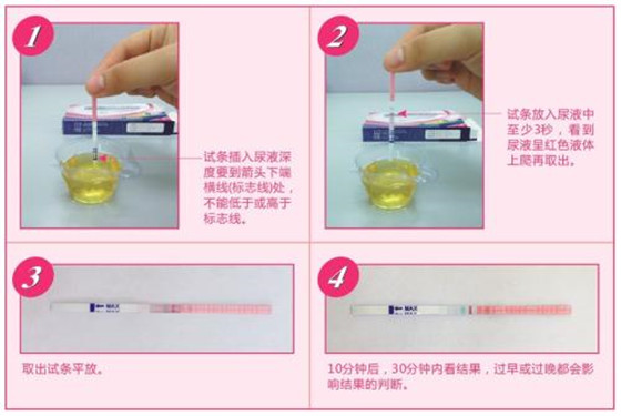 2、使用排卵试纸时与早孕试纸的方法差不多,将试条带有箭头的一端浸入尿液中,约3秒钟后取出平放,在10-20分钟内读取结果数据。