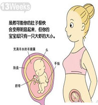 怀孕13周已经进入怀孕3个月后的第一个孕周期了,此时的胎儿看上去更象一个漂亮娃娃了,胎儿从头到臀的长度大概只有7.5厘米,差不多相当于一只大虾的大小,重量只有大约28克。