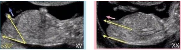 男孩的特征点与身体呈45度角,还多一些,而女孩儿的特征点几乎和躯体平行。还有就是如果是男宝宝,屁股位置会微微上翘,后背脊柱成圆弧状,因为要留空间发育前列腺,相反,女宝宝后背脊柱就相对就平一些,如下图所示: