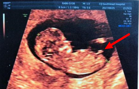 小肿块以一个陡峭的角度向上指,显示这个胎儿是个男孩。