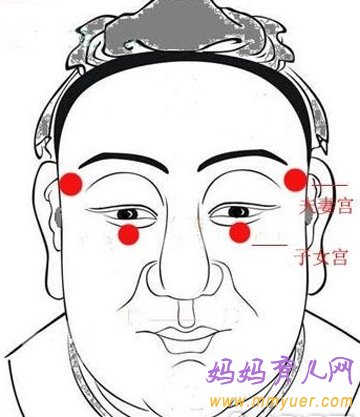 依照生男生女面相学的说法,丈夫的夫妻宫气色黄亮温润的话,表示妻子怀胎顺利,容易生儿子;丈夫的夫妻宫气色灰蒙泛表,则表示妻子怀胎不顺利,容易生的女儿。