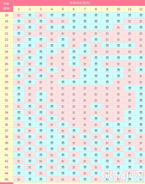 找出你对应的虚岁+对应的受孕月份,所测得结果便表明你很有可能生男孩/女孩。如果受孕是在闰月,上半月以上个月份算,下半个月以下一个月份算,记得是按受孕当天,不是末次月经第一天。