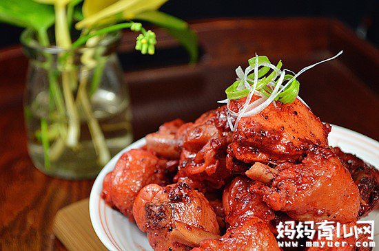 ③将步骤①和②的材料盛入锅内,再加1/2碗水和调味料,煮至鸡肉熟烂入味,即可熄火。