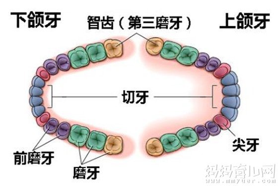智齿:学名第三大臼齿,俗称智慧齿、立事牙、尽头牙,是口腔最靠近喉咙的牙齿,如果全部生长出来一共4颗,上下颚各两颗,一般是于16岁或之后才生长出来,相较于幼儿时期长出的乳齿与儿童时期更换的恒齿,智齿通常是在人类心智已经趋于成熟时才长出,因而得名。