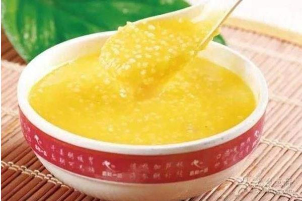 做法:将小米和黄豆分别放入搅碎机中磨碎,然后将黄豆用筛网进行过滤,小米在水中沉淀后用开水调匀;准备一个煮锅,锅中放入适量的清水,当水烧开后先放入黄豆浆,用大火煮开后放入小米转为小火慢煮,将粥煮至粘稠后放入适量的白砂糖调味即可起锅食用。