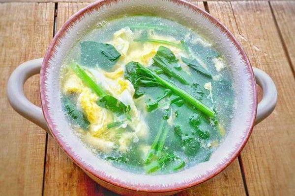 做法:将菠菜洗净后沥干多于的水分备用,将鸡蛋敲碎后放入碗中搅拌均匀;锅中烧热水水开后将菠菜放入焯水后捞出切段;然后在锅中烧热油,先放入适量的葱姜丝爆香后加入适量的清水,然后将鸡蛋液倒入锅中充分的搅拌成蛋花;将菠菜放入煮熟后,加入适量的食盐和香油即可食用。