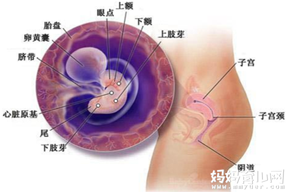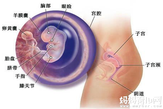 第8周的胚胎大约有16毫米长,看上去像颗葡萄。胚胎的器官已经开始有明显的特征,手指和脚趾间看上去有少量的蹼状物。