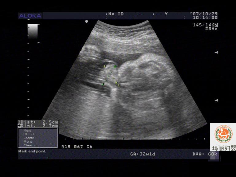 宫内胎儿头位,双顶径9.0CM,头围32.0CM,腹围28.0CM,股骨长5.2CM,肱骨长4.4CM,胎心率122次/
