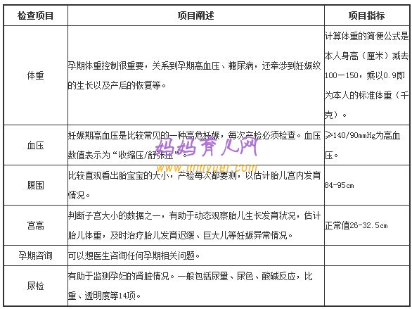 【产检项目】:血压、体重、宫底高度、腹围、胎心率、血常规、尿常规。