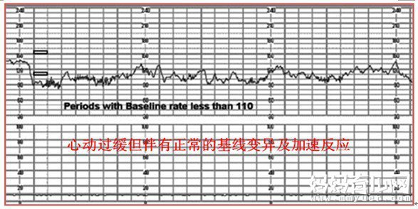 什么是胎儿心动过缓?指胎心率基线水平低于110次/分。如下图所示: