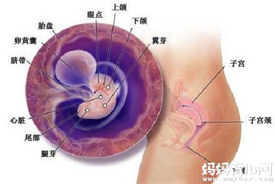 胚胎已具有人雏形,体节已全部分化,四肢分出,各系统进一步发育。B超清楚看到胎芽及胎心跳,胎囊约占宫腔的l/3。