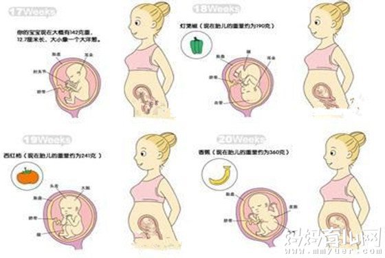 在孕17周时胎儿从头到臀长约有13cm,重约150-200克。双顶径的平均值为3.97±0.44cm,腹围的平均值为11.49±1.62cm,股骨长为 2.52±0.44cm。