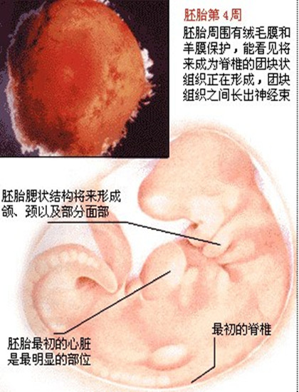 孕4周: 胎儿只有0.2厘米。受精卵刚完成着床,羊膜腔才形成,体积很小。超声还看不清妊娠迹象。
