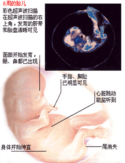 孕8周: 胎儿长到1.66厘米,胎形已定,可分出胎头、体及四肢,胎头大于躯干。B超可见胎囊约占官腔1/2,胎儿形态及胎动清楚可见,并可看见卵黄囊。
