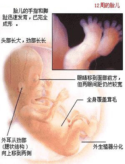 孕12周: 胎儿长到4.58厘米,外生殖器初步发育,如有畸形可以表现,头颅钙化更趋完善。颅骨光环清楚,可测双顶径,明显的畸形可以诊断,此后各脏器趋向完善。