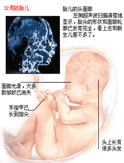 孕32周: 双顶径的平均值为8.17士0.65'腹围的平均值为:26.20士2.33'股骨长的平均值为6点43士0.49.