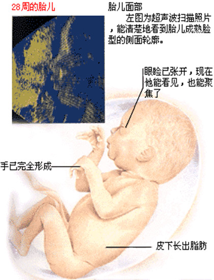 孕28周: 双顶径的平均值为7.24士O.65'腹围的平均值为22.86士2.41'股骨长为5.35士0.55.
