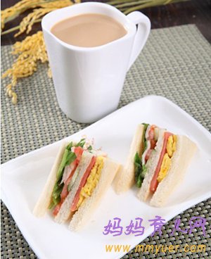 三明治搭配了牛肉和蔬菜,牛肉可提高孕妇的免疫力,有助安胎,实现全面营养。