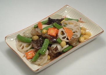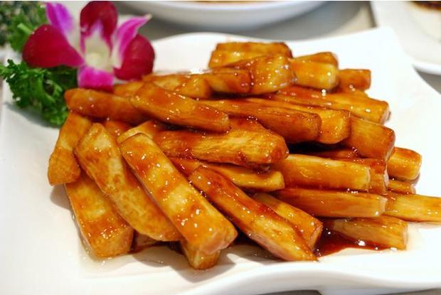 3、炒锅控净油,加醋及糖水,烧开后再倒入山药块,用面粉80克(面粉50克加水)使汁收浓,裹匀山药块,即成。