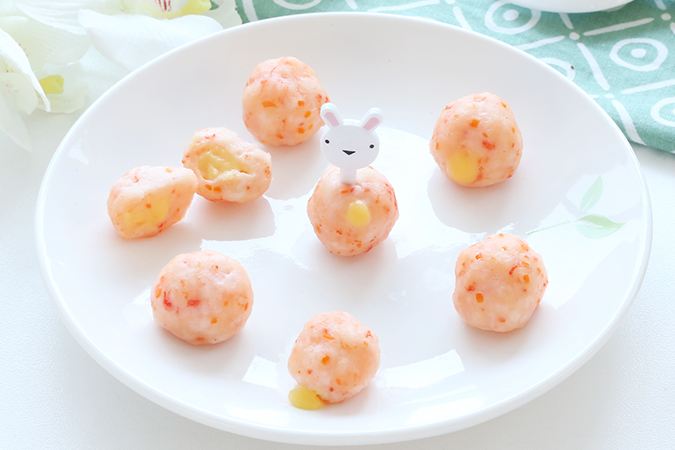 1、猪肉剁成肉末,加入少许胡萝卜碎、盐、糖、料酒和生姜泡的水搅拌均匀