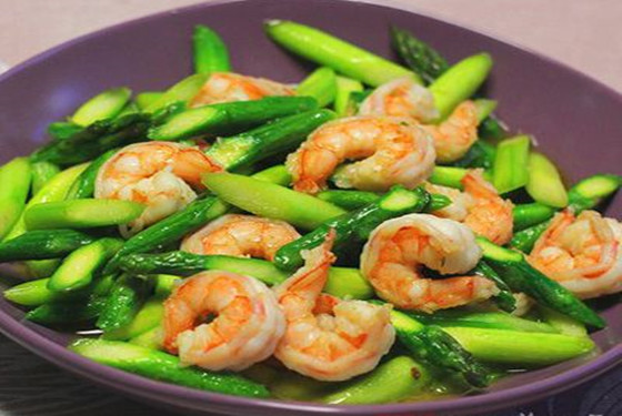 清炒芦笋虾仁:虾仁挑去泥肠洗净,拌入调料后过油捞出;芦笋洗净,用开水汆烫后冲凉,切小段;接着放入虾仁和料酒、盐、白糖、白胡椒、勾芡、炒匀即可。