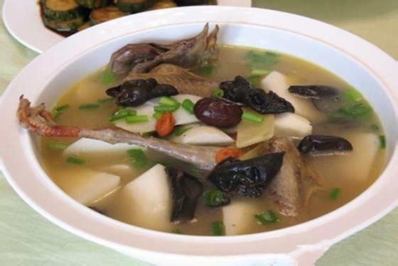 乌鸡补肾汤:将中药包(金樱子、枸杞子、钩藤、鸡血藤、毛狗脊各15克)包好,放在鸡腹里;锅中加清水、葱姜、料酒等与鸡一起用旺火煮沸;转为小火炖至肉烂熟调味即可。