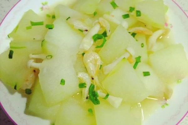 做法:将冬瓜和虾皮洗净,冬瓜去皮切块,葱姜蒜全部切沫备用;锅中烧热油先将葱姜蒜倒入炒香,然后放入冬瓜和适量的水,冬瓜煮制软烂后加入虾皮,起锅前放适量的食盐即可。