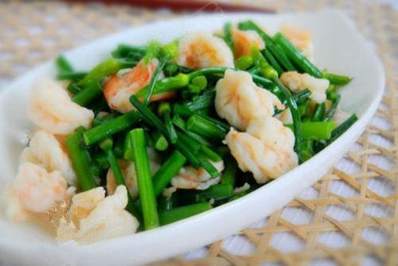 做法:韭菜清洗干净后切成小段,新鲜的河虾抽去虾线,从背部切开备用,锅中放多点油,爆香葱姜蒜丝,将虾放入煎一煎,等到快断生时放入韭菜段同炒,放入酱油、香油,调入少量盐后起锅装盘。